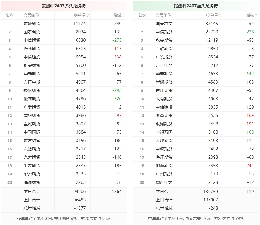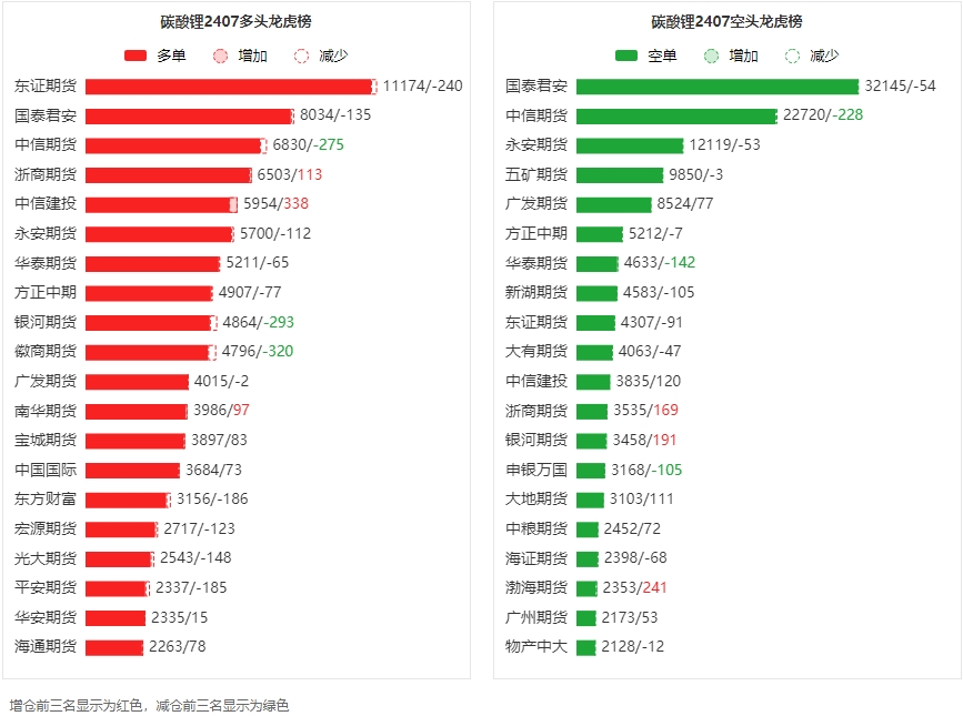 总体而言,碳酸锂2407合约今日减仓下行,多空持仓排名前20席中,多空双方均呈退场态势,多头退场意愿强于空头。