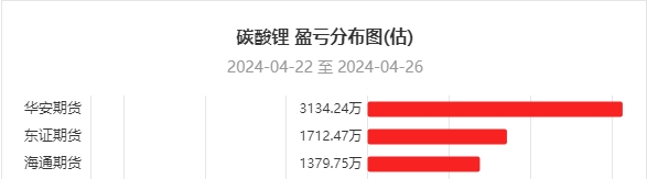 盈亏剖析:数据显示,一周内华安期货、东证期货、海通期货在碳酸锂上盈利居前,三机构分别盈利3134.24万元,1712.47万元,1379.75万元。